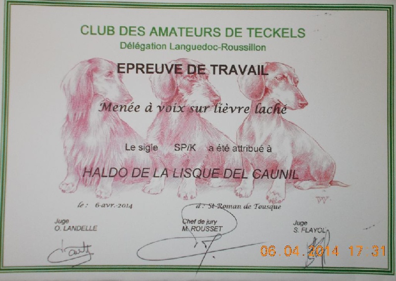 Haldo de la Lisque del Caunil Un gros bébé !!! J'aide au bois !!!! Ma première expo. J'apprends la garde de la veste !!! 2ème expo. 3ème expo. 4ème expo. De mieux en mieux. Avec ma soeur en sortant de terrier Encore une !!! Voir ma fiche !!! En sortant du terrier avec le diable noir Déclic !!!! Ca continue !!! Mon premier CACS à Perpignan. Mon deuxième CACS à ALES §§§ Mon premier sigle en travail !!!! Ma RCACS à Limoges Avec ma maman Folie !!!! Avec ma soeur, mon premier renard au naturel !!! Avec ma copine Iodie, deux faisans !!! Mon premier lièvre !!! CACS obtenu le 24.01.15 à Perpignan exposition canine internationale